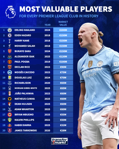 وتصدر النرويجي إيرلينغ هالاند، مهاجم مانشستر سيتي، قائمة أغلى اللاعبين في تاريخ الدوري الإنجليزي، بعد أن بلغت قيمته التسويقية في العام الماضي 200 مليون يورو، متفوقًا على كل من: إيدين هازارد نجم تشيلسي المعتزل، وهاري كين مهاجم توتنهام وبايرن ميونخ الحالي، ومحمد صلاح، فيما جاء بوكايو ساكا لاعب أرسنال ومنتخب إنجلترا في المرتبة الخامسة.