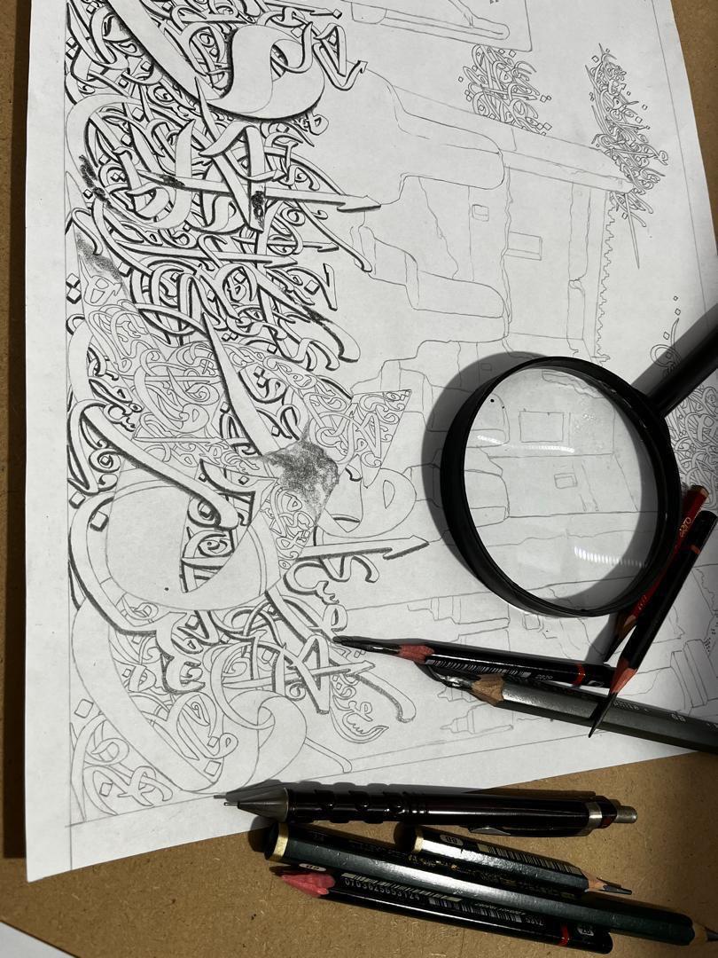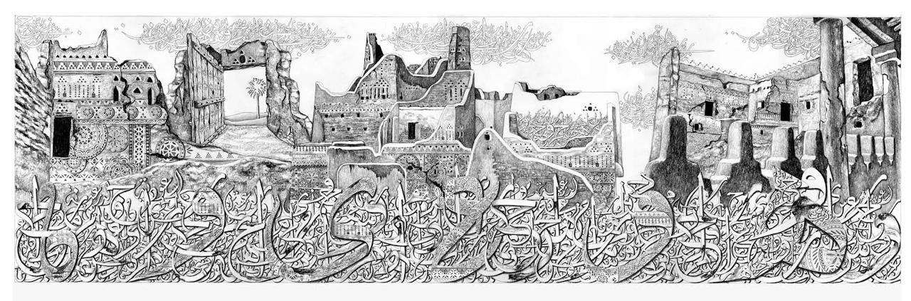* الخط العربي الحامي: تنتشر الحروف العربية بخطوط أصيلة وممتدة، وكأنها تحيط بالعمران وتحتضنه، لتؤكد على دور اللغة في صون وحراسة الذاكرة الثقافية.