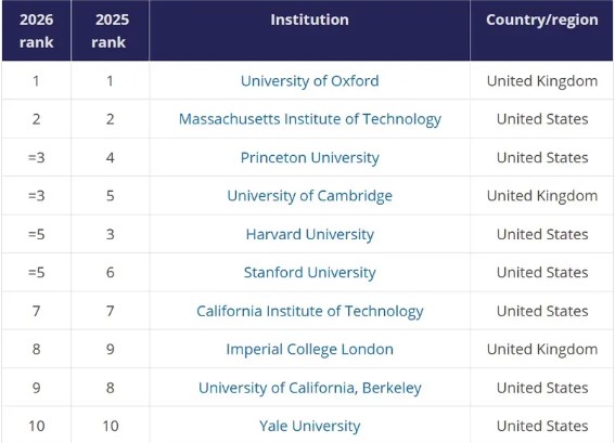 أظهر التقرير أن الولايات المتحدة لا تزال اللاعب الأبرز في التعليم العالي عالمياً، مع حجز 7 من جامعاتها مواقع داخل قائمة أفضل 10 جامعات، بينما ذهبت المراكز الثلاثة الأخرى إلى مؤسسات بريطانية.