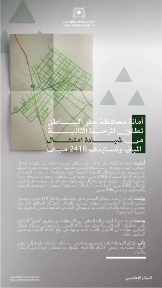 وقالت الأمانة أن المرحلة الثانية تستهدف 2418 مبنى، موزعة على البلديات الفرعية والمرتبطة، حيث تشمل البلديات الفرعية: شرق حفر الباطن، جنوب حفر الباطن، وغرب حفر الباطن، بإجمالي 2022 مبنى، فيما تشمل البلديات المرتبطة: السعيرة، القيصومة، الذيبية، والصداوي، بإجمالي 396 مبنى.