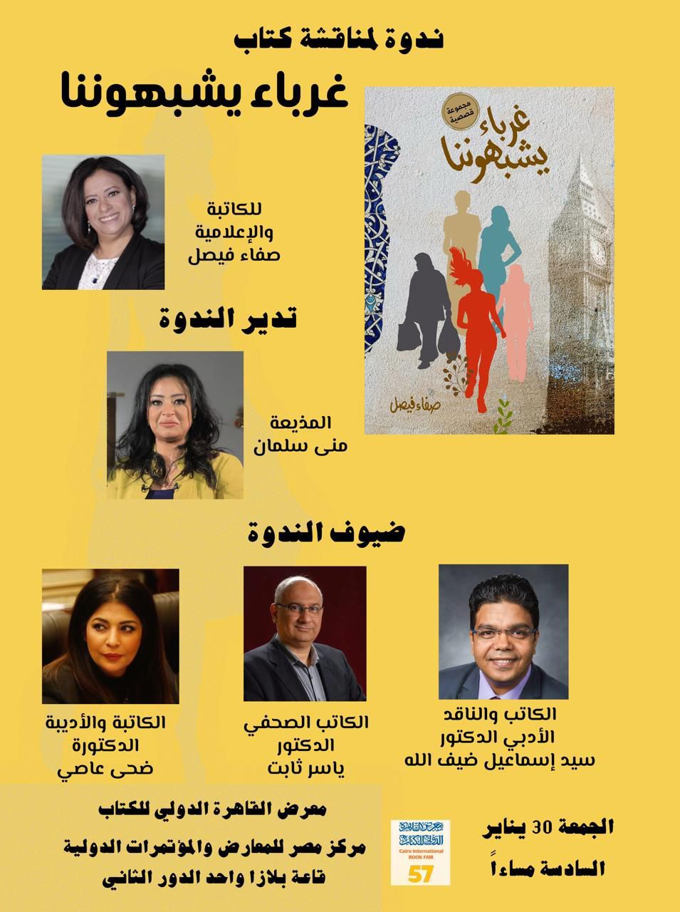 تطلق الإعلامية والكاتبة المصرية صفاء فيصل مجموعتها القصصية الأولي بعنوان "غرباء يشبهوننا" في معرض القاهرة الدولي للكتاب في دورته الـ57، تروي فيها قصصا من حياتها في بريطانيا، عاصمة الضباب.